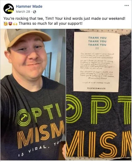 With stores closed during the shutdown, we created special t-shirts and sold them to raise funds for laid-off employees of Hammer Made. The effort generated as much buzz as it did money.